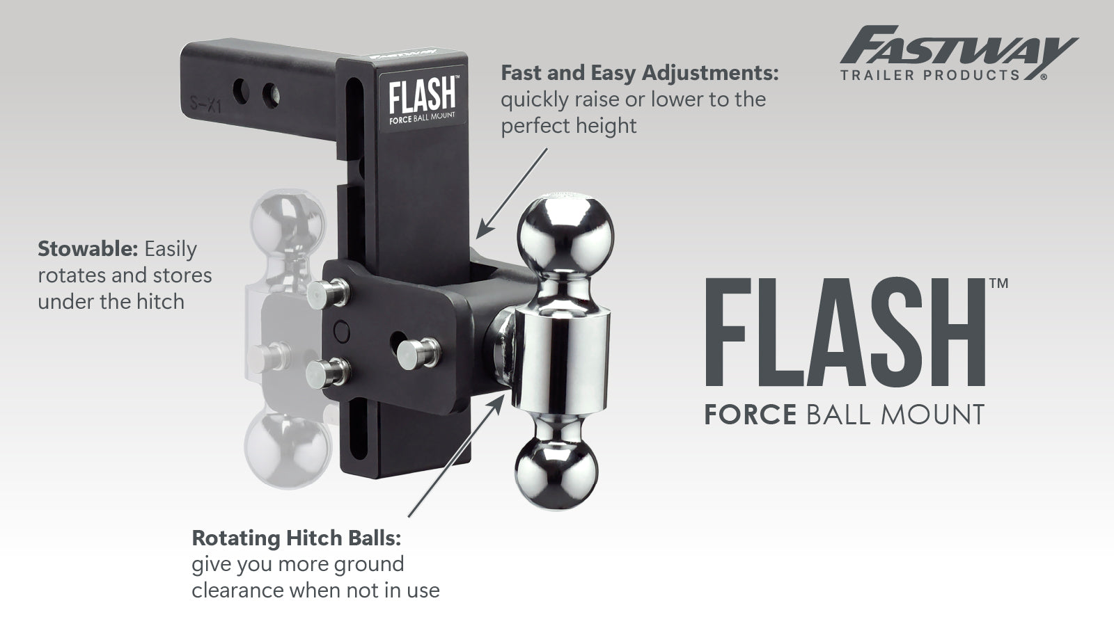 The FLASH™ FORCE™ Adjustable Ball Mount streamlines hitching and unhitching with effortless adjustments and dual hitch balls—perfect for towing multiple trailers. Simply remove the two stainless steel adjustment pins to raise or lower the ball mount to the ideal height for your truck and trailer, then rotate the ball assembly to switch between hitch sizes.